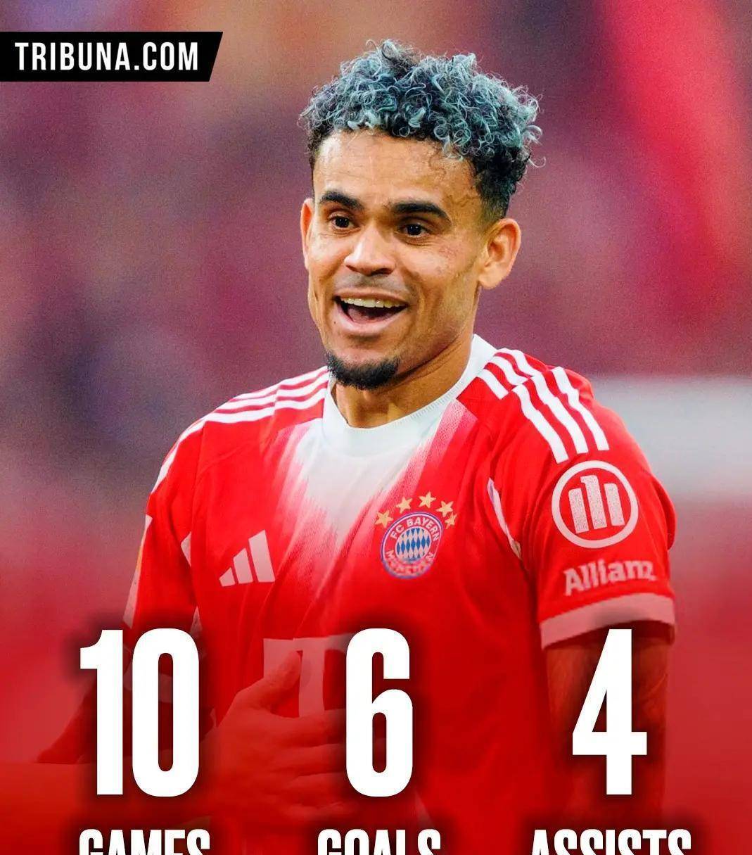 来到德甲后,迪亚斯迅速成为了拜仁进攻端的重要一环。 他与凯恩、奥利塞组成了令人生畏的前场三叉戟。 在拜仁各项赛事10连胜期间,迪亚斯拿出了6球4助攻的惊人数据,场均直接参与一球。 这样的效率让对手防不胜防。